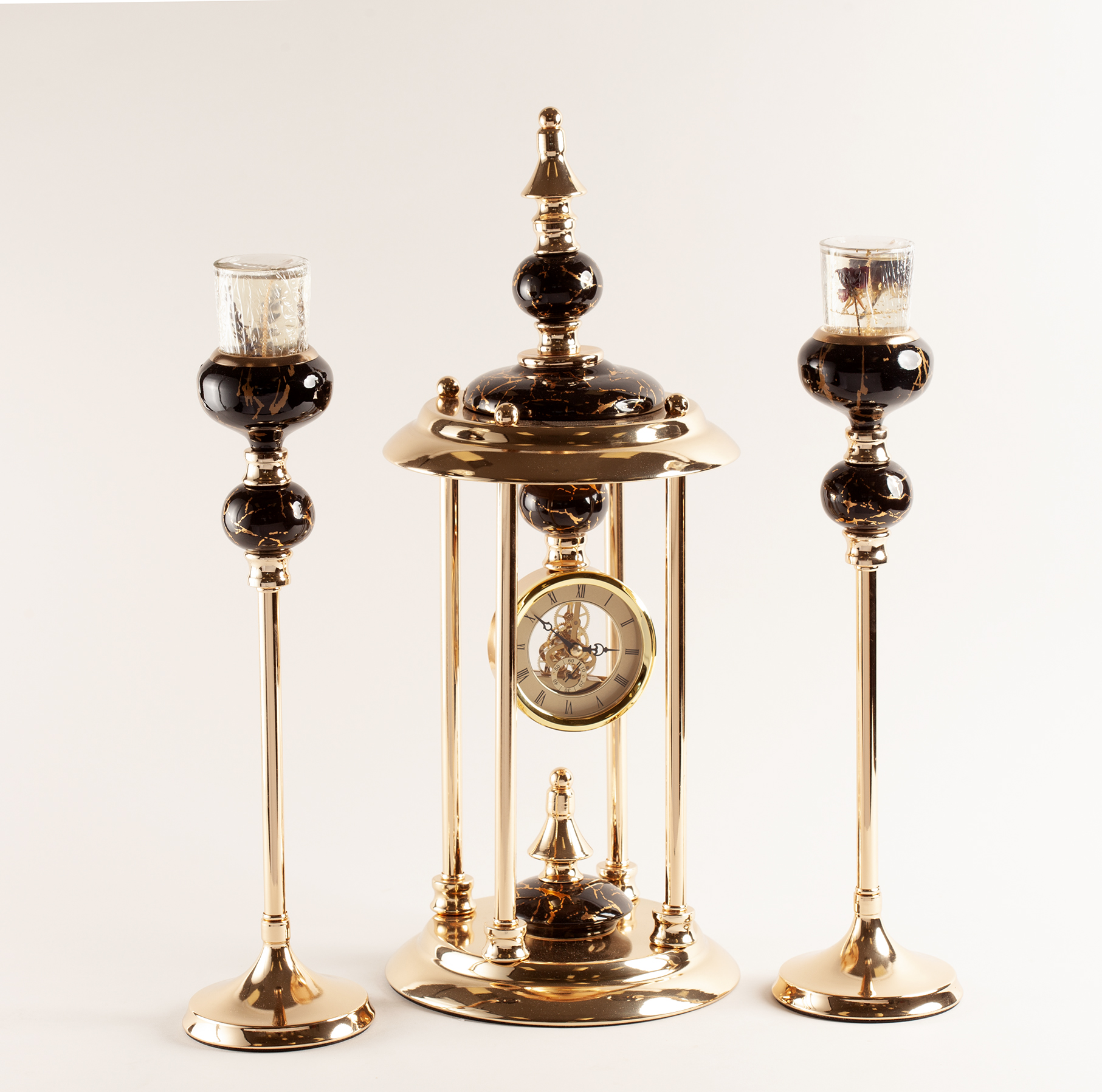Add a touch of sophisticated style to your fireplace mantle or office space with our elegant black and gold clock and candleholder set.